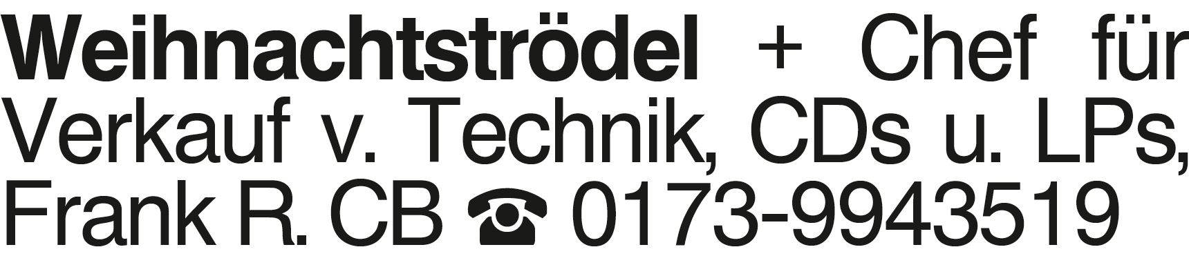 Weihnachtströdel + Chef f Weihnachtströdel + Chef für Verkauf v. Technik, CDs u. LPs, Frank R. CB 0173-9943519Das könnte Sie auch interessieren