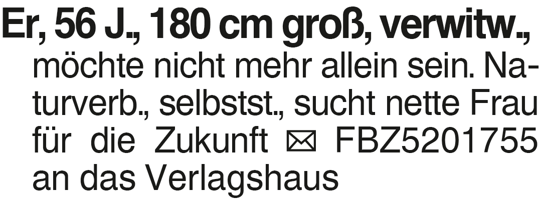 Er, 56 J., 180 cm groß, v Er, 56 J., 180 cm groß, verwitw., möchte nicht mehr allein sein. Naturverb., selbstst., sucht nette Frau für die Zukunft FBZ5201755 an das VerlagshausDas könnte Sie auch interessieren