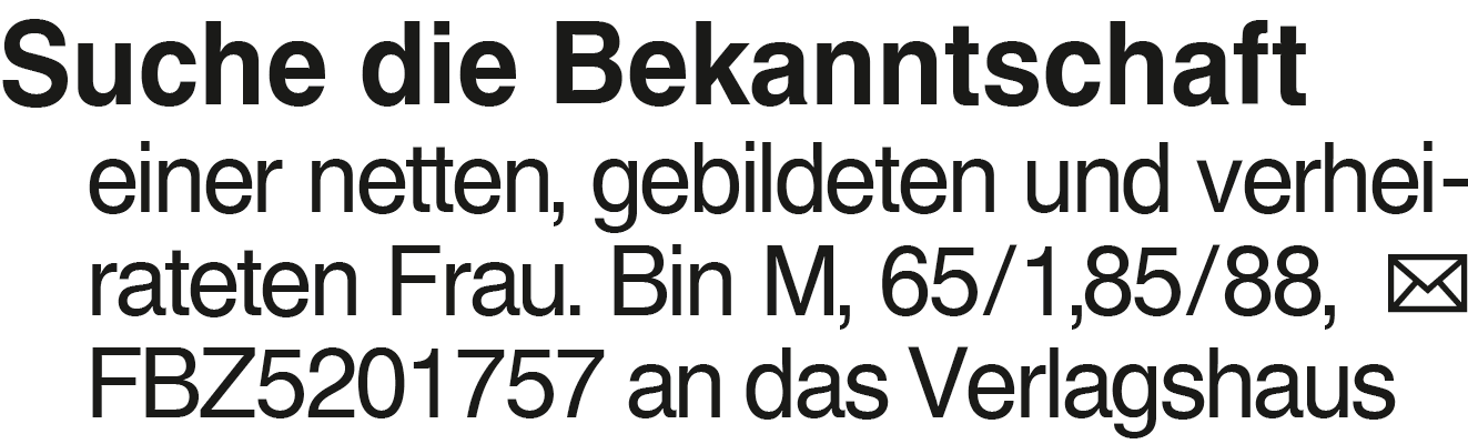 Suche die Bekanntschaft e Suche die Bekanntschaft einer netten, gebildeten und verheirateten Frau. Bin M, 65/1,85/88, FBZ5201757 an das VerlagshausDas könnte Sie auch interessieren