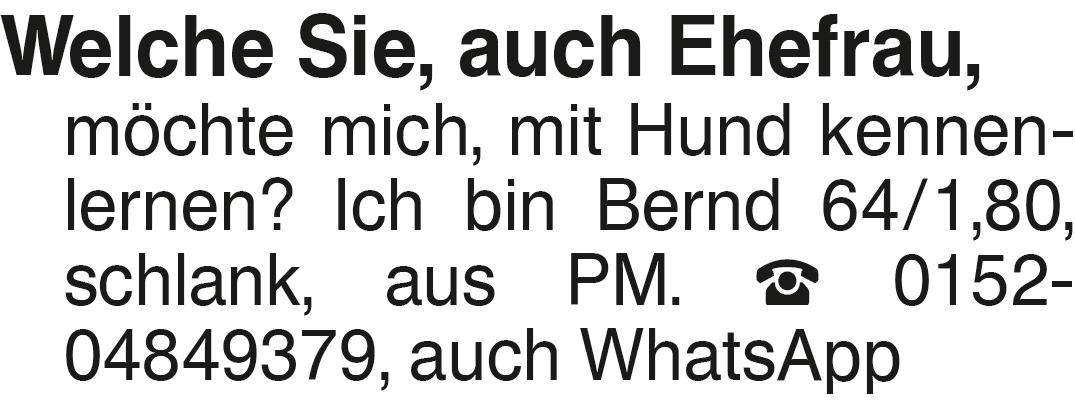 Welche Sie, auch Ehefrau, Welche Sie, auch Ehefrau, möchte mich, mit Hund kennenlernen? Ich bin Bernd 64/1,80, schlank, aus PM. 0152-04849379, auch WhatsAppDas könnte Sie auch interessieren