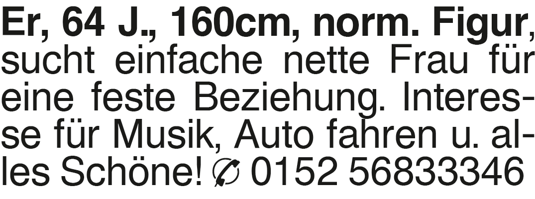 Er, 64 J., 160cm, norm. F Er, 64 J., 160cm, norm. Figur, sucht einfache nette Frau für eine feste Beziehung. Interesse für Musik, Auto fahren u. alles Schöne! 0152 56833346