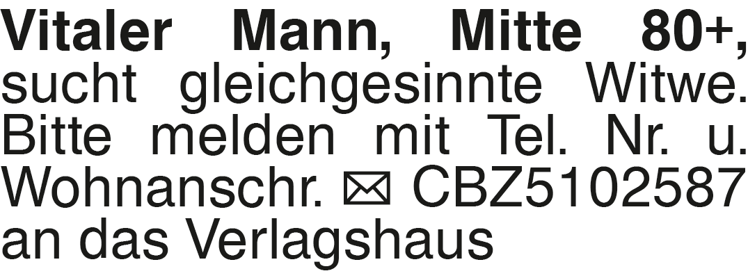 Vitaler Mann, Mitte 80+, Vitaler Mann, Mitte 80+, sucht gleichgesinnte Witwe. Bitte melden mit Tel. Nr. u. Wohnanschr. CBZ5102587 an das VerlagshausDas könnte Sie auch interessieren