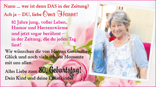 Nanu # wer ist denn DAS i Nanu # wer ist denn DAS in der Zeitung? Ach ja # DU, liebe Oma Hanne! 80 Jahre jung, voller Leben, Humor und Herzenswärme und jetzt sogar berühmt # in der Zeitung, die du jeden Tag liest! Wir wünschen dir von Herzen Gesundheit, Glück und noch viele schöne Momente mit uns allen. Alles Liebe zum 80. Geburtstag! Dein Kind und deine EnkelkinderDas könnte Sie auch interessieren