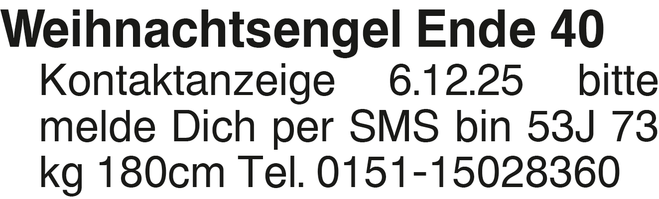 Weihnachtsengel Ende 40 K Kontaktanzeige 6.12.25 bitte melde Dich per SMS bin 53J 73 kg 180cm Tel. 0151-15028360Das könnte Sie auch interessieren