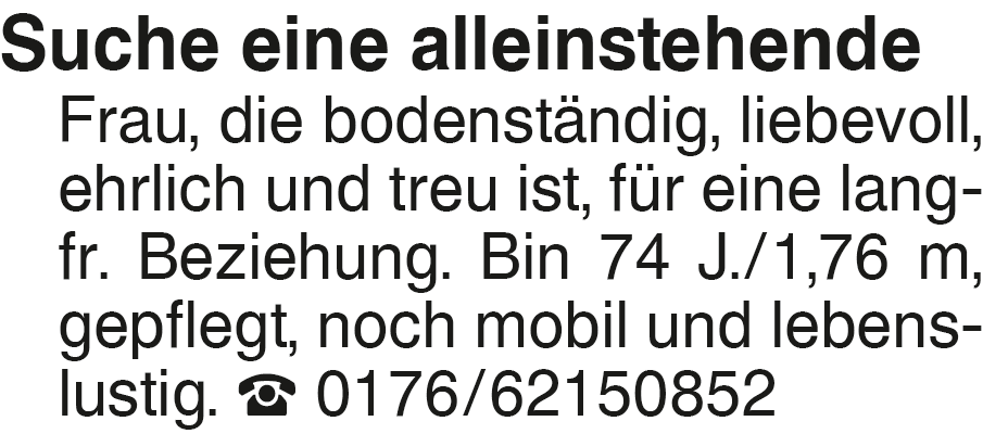 Suche eine alleinstehende Suche eine alleinstehende Frau, die bodenständig, liebevoll, ehrlich und treu ist, für eine langfr. Beziehung. Bin 74 J./1,76 m, gepflegt, noch mobil und lebenslustig. 0176/62150852