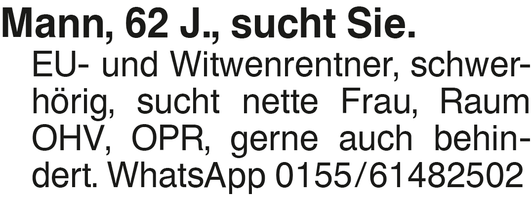 Mann, 62 J., sucht Sie. E Mann, 62 J., sucht Sie. EU- und Witwenrentner, schwerhörig, sucht nette Frau, Raum OHV, OPR, gerne auch behindert. WhatsApp 0155/61482502