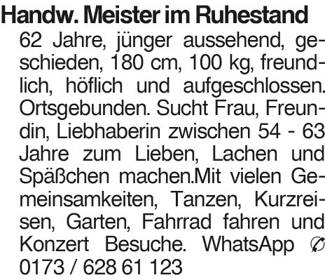 Handw. Meister im Ruhest Handw. Meister im Ruhestand 62 Jahre, jünger aussehend, geschieden, 180 cm, 100 kg, freundlich, höflich und aufgeschlossen. Ortsgebunden. Sucht Frau, Freundin, Liebhaberin zwischen 54 - 63 Jahre zum Lieben, Lachen und Späßchen machen.Mit vielen Gemeinsamkeiten, Tanzen, Kurzreisen, Garten, Fahrrad fahren und Konzert Besuche. WhatsApp 0173 / 628 61 123Das könnte Sie auch interessieren