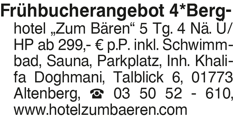 Frühbucherangebot Frühbucherangebot 4 Berg- hotel Zum Bären 5 Tg. 4 Nä. Ü/HP ab 299,- EUR p.P. inkl. Schwimmbad, Sauna, Parkplatz, Inh. Khalifa Doghmani, Talblick 6, 01773 Altenberg, 03 50 52 - 610, www.hotelzumbaeren.comDas könnte Sie auch interessieren