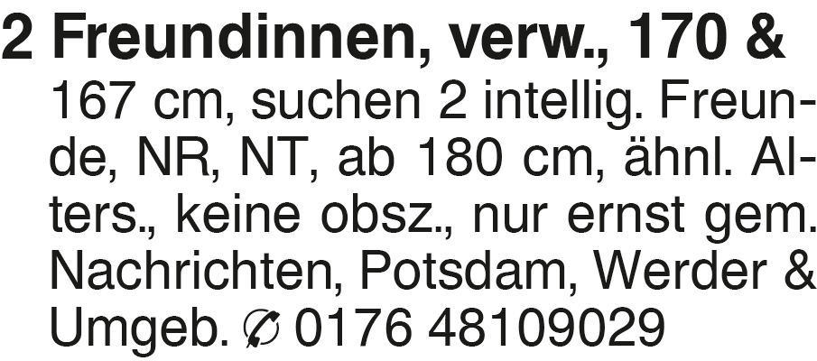 2 Freundinnen, verw., 170 2 Freundinnen, verw., 170 & 167 cm, suchen 2 intellig. Freunde, NR, NT, ab 180 cm, ähnl. Alters., keine obsz., nur ernst gem. Nachrichten, Potsdam, Werder & Umgeb. 0176 48109029