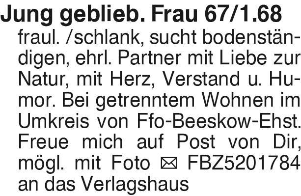 Jung geblieb. Frau 67/1.6 Jung geblieb. Frau 67/1.68 fraul. /schlank, sucht bodenständigen, ehrl. Partner mit Liebe zur Natur, mit Herz, Verstand u. Humor. Bei getrenntem Wohnen im Umkreis von Ffo-Beeskow-Ehst. Freue mich auf Post von Dir, mögl. mit Foto FBZ5201784 an das VerlagshausDas könnte Sie auch interessieren