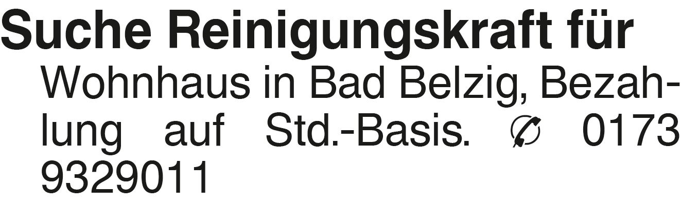 Suche Reinigungskraft für Suche Reinigungskraft für Wohnhaus in Bad Belzig, Bezahlung auf Std.-Basis. 0173 9329011Kontakt
