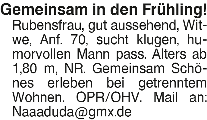 Gemeinsam in den Frühling Gemeinsam in den Frühling! Rubensfrau, gut aussehend, Witwe, Anf. 70, sucht klugen, humorvollen Mann pass. Alters ab 1,80 m, NR. Gemeinsam Schönes erleben bei getrenntem Wohnen. OPR/OHV. Mail an: Naaaduda@gmx.deDas könnte Sie auch interessieren
