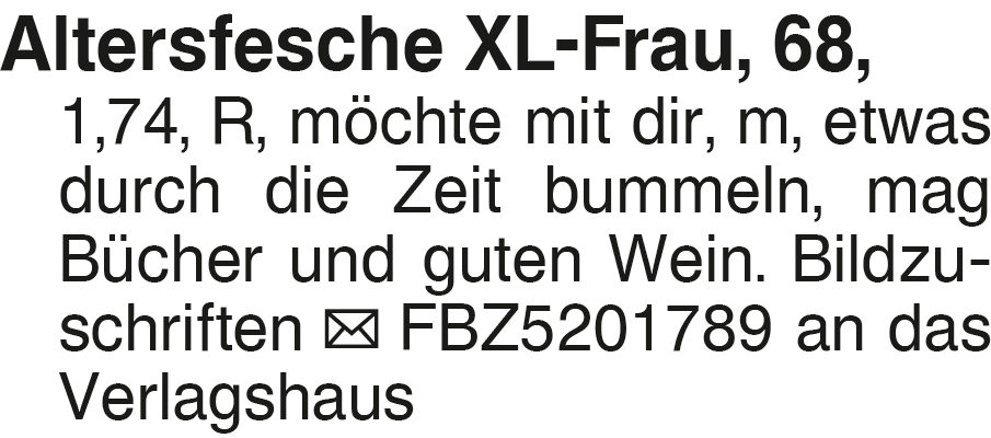 Altersfesche XL-Frau, 68, Altersfesche XL-Frau, 68, 1,74, R, möchte mit dir, m, etwas durch die Zeit bummeln, mag Bücher und guten Wein. Bildzuschriften FBZ5201789 an das VerlagshausDas könnte Sie auch interessieren