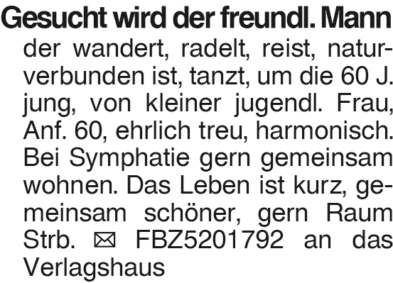 Gesucht wird der freundli Gesucht wird der freundl. Mann der wandert, radelt, reist, naturverbunden ist, tanzt, um die 60 J. jung, von kleiner jugendl. Frau, Anf. 60, ehrlich treu, harmonisch. Bei Symphatie gern gemeinsam wohnen. Das Leben ist kurz, gemeinsam schöner, gern Raum Strb. FBZ5201792 an das VerlagshausDas könnte Sie auch interessieren