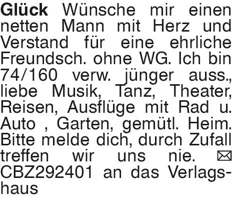 Glück Wünsche mir einen n Wünsche mir einen netten Mann mit Herz und Verstand für eine ehrliche Freundsch. ohne WG. Ich bin 74/160 verw. jünger auss., liebe Musik, Tanz, Theater, Reisen, Ausflüge mit Rad u. Auto , Garten, gemütl. Heim. Bitte melde dich, durch Zufall treffen wir uns nie.Das könnte Sie auch interessieren