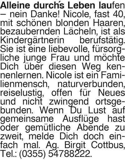 Nicole Alleine durch´s Leben laufen # nein Danke! Nicole, fast 40, mit schönen blonden Haaren, bezaubernden Lächeln, ist als Kindergärtnerin berufstätig. Sie ist eine liebevolle, fürsorgliche junge Frau und möchte Dich über diesen Weg kennenlernen. Nicole ist ein Familienmensch, naturverbunden, reiselustig, offen für Neues und nicht zwingend ortsgebunden. Wenn Du Lust auf gemeinsame Ausflüge hast oder gemütliche Abende zu zweit, melde Dich doch einfach mal. Ag. Birgit Cottbus, Tel.: (0355) 54788222.Das könnte Sie auch interessieren