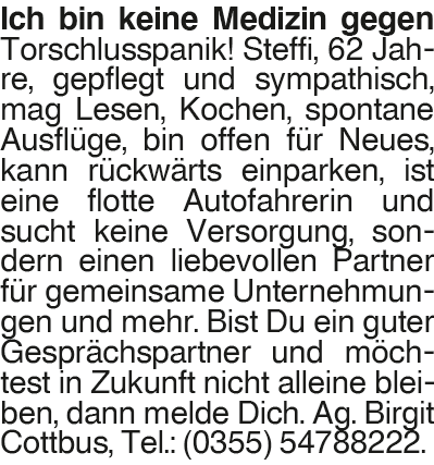 Steffi 62 Ich bin keine Medizin gegen Torschlusspanik! Steffi, 62 Jahre, gepflegt und sympathisch, mag Lesen, Kochen, spontane Ausflüge, bin offen für Neues, kann rückwärts einparken, ist eine flotte Autofahrerin und sucht keine Versorgung, sondern einen liebevollen Partner für gemeinsame Unternehmungen und mehr. Bist Du ein guter Gesprächspartner und möchtest in Zukunft nicht alleine bleiben, dann melde Dich. Ag. Birgit Cottbus, Tel.: (0355) 54788222.Das könnte Sie auch interessieren