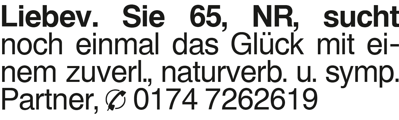 Liebev. Sie 65, NR, sucht Liebev. Sie 65, NR, sucht noch einmal das Glück mit einem zuverl., naturverb. u. symp. Partner, 0174 7262619Das könnte Sie auch interessieren
