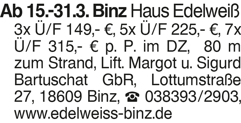 Haus Edelweiss Ab 15.-31.3. Binz Haus Edelweiß 3x Ü/F 149,- EUR, 5x Ü/F 225,- EUR, 7x Ü/F 315,- EUR p. P. im DZ, 80 m zum Strand, Lift. Margot u. Sigurd Bartuschat GbR, Lottumstraße 27, 18609 Binz, 038393/2903, www.edelweiss-binz.deDas könnte Sie auch interessieren