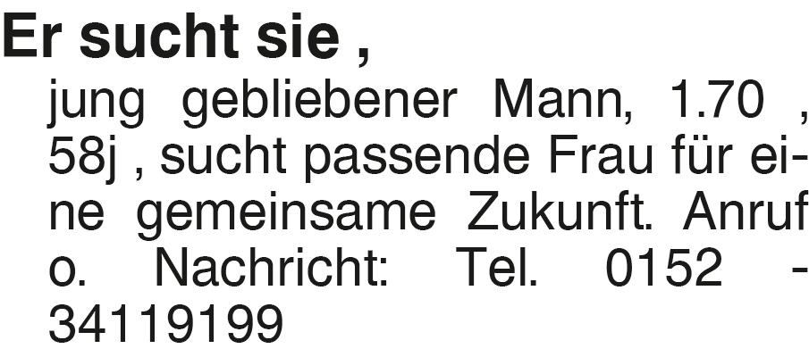 Er sucht sie , jung gebli jung gebliebener Mann, 1.70 , 58j , sucht passende Frau für eine gemeinsame Zukunft. Anruf o. Nachricht: Tel. 0152 -34119199Das könnte Sie auch interessieren