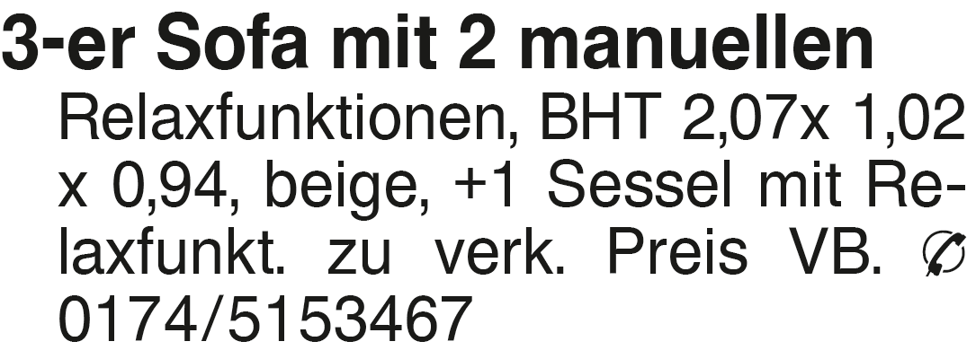 3-er Sofa mit 2 manuellen 3-er Sofa mit 2 manuellen Relaxfunktionen, BHT 2,07x 1,02 x 0,94, beige, +1 Sessel mit Relaxfunkt. zu verk. Preis VB. 0174/5153467Das könnte Sie auch interessieren