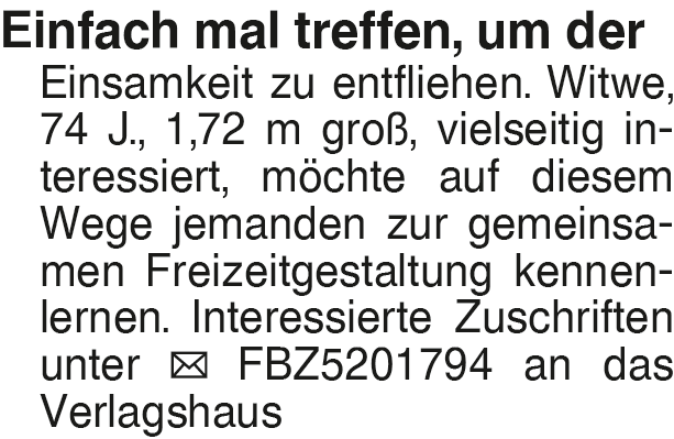 Einfach mal treffen, um d Einfach mal treffen, um der Einsamkeit zu entfliehen. Witwe, 74 J., 1,72 m groß, vielseitig interessiert, möchte auf diesem Wege jemanden zur gemeinsamen Freizeitgestaltung kennenlernen. Interessierte Zuschriften unter FBZ5201794 an das VerlagshausDas könnte Sie auch interessieren