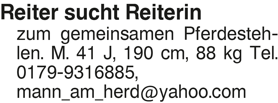 Reiter sucht Reiterin zum zum gemeinsamen Pferdestehlen. M. 41 J, 190 cm, 88 kg Tel. 0179-9316885, mann_am_herd@yahoo.comDas könnte Sie auch interessieren
