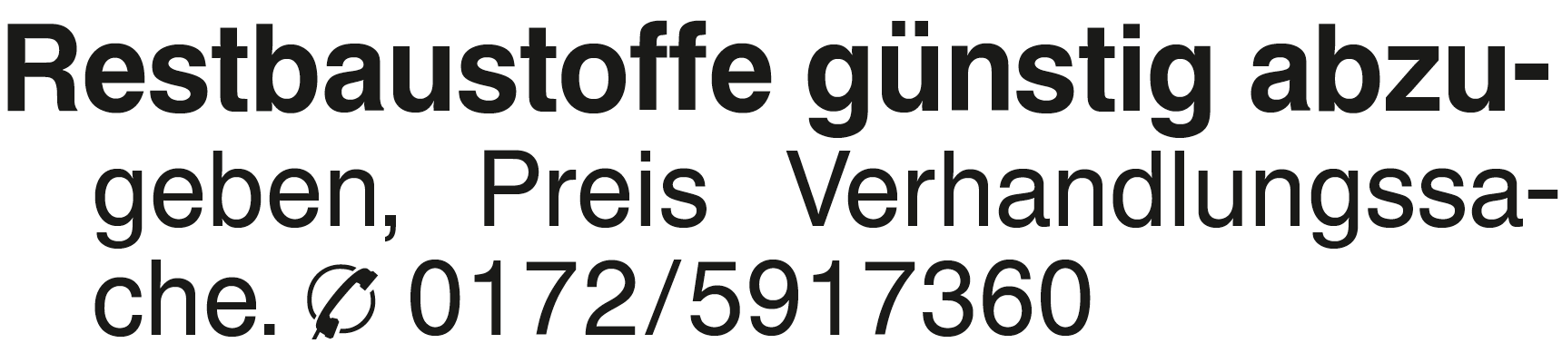 Restbaustoffe günstig abz Restbaustoffe günstig abzu- geben, Preis Verhandlungssache. 0172/5917360Das könnte Sie auch interessieren