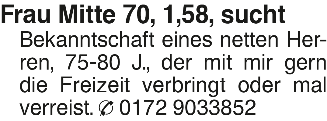Frau Mitte 70, 1,58, such Frau Mitte 70, 1,58, sucht Bekanntschaft eines netten Herren, 75-80 J., der mit mir gern die Freizeit verbringt oder mal verreist. 0172 9033852Das könnte Sie auch interessieren