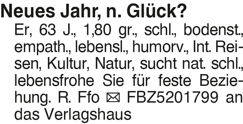 Neues Jahr, n. Glück? Er, Neues Jahr, n. Glück? Er, 63 J., 1,80 gr., schl., bodenst., empath., lebensl., humorv., Int. Reisen, Kultur, Natur, sucht nat. schl., lebensfrohe Sie für feste Beziehung. R. Ffo FBZ5201799 an das VerlagshausDas könnte Sie auch interessieren