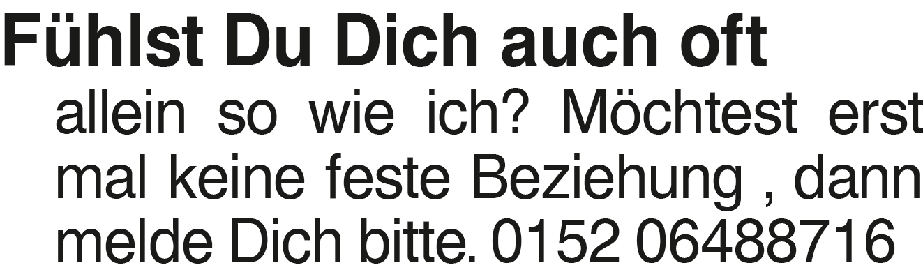 Fühlst Du Dich auch oft a Fühlst Du Dich auch oft allein so wie ich? Möchtest erst mal keine feste Beziehung , dann melde Dich bitte. 0152 06488716Das könnte Sie auch interessieren