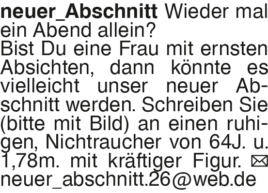 neuer_Abschnitt Wieder ma Wieder mal ein Abend allein? Bist Du eine Frau mit ernsten Absichten, dann könnte es vielleicht unser neuer Abschnitt werden. Schreiben Sie (bitte mit Bild) an einen ruhigen, Nichtraucher von 64J. u. 1,78m. mit kräftiger Figur. neuer_abschnitt.26@web.deDas könnte Sie auch interessieren