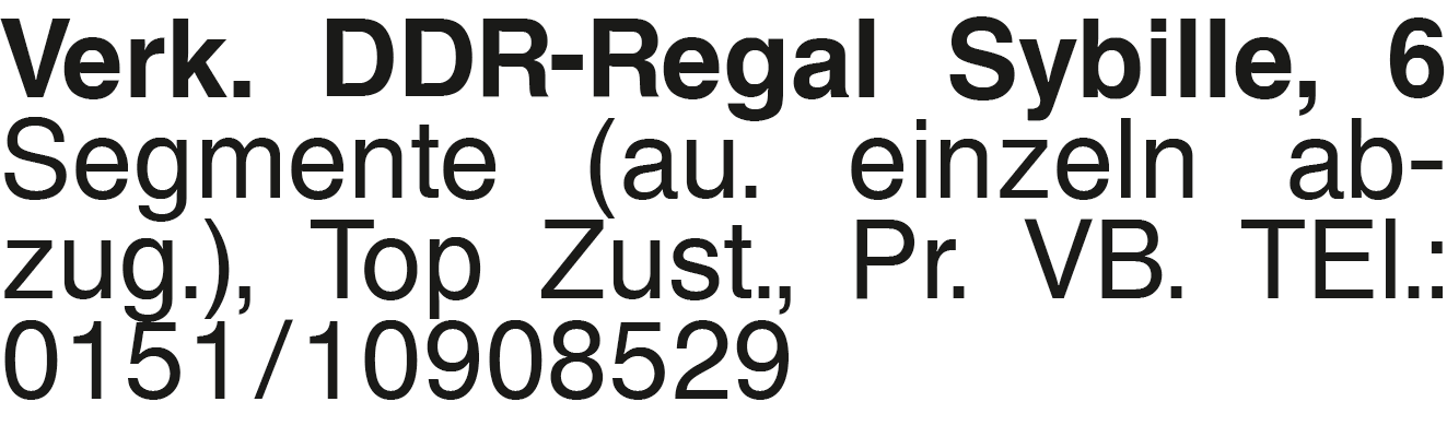 Verk. DDR-Regal Sybille, Verk. DDR-Regal Sybille, 6 Segmente (au. einzeln abzug.), Top Zust., Pr. VB. TEl.: 0151/10908529