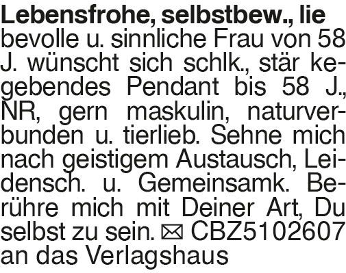 Lebensfrohe, selbstbew., Lebensfrohe, selbstbew., lie bevolle u. sinnliche Frau von 58 J. wünscht sich schlk., stär kegebendes Pendant bis 58 J., NR, gern maskulin, naturverbunden u. tierlieb. Sehne mich nach geistigem Austausch, Leidensch. u. Gemeinsamk. Berühre mich mit Deiner Art, Du selbst zu sein. CBZ5102607 an das VerlagshausKontakt