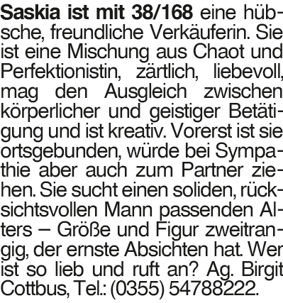 Saskia 38 Saskia ist mit 38/168 eine hübsche, freundliche Verkäuferin. Sie ist eine Mischung aus Chaot und Perfektionistin, zärtlich, liebevoll, mag den Ausgleich zwischen körperlicher und geistiger Betätigung und ist kreativ. Vorerst ist sie ortsgebunden, würde bei Sympathie aber auch zum Partner ziehen. Sie sucht einen soliden, rücksichtsvollen Mann passenden Alters # Größe und Figur zweitrangig, der ernste Absichten hat. Wer ist so lieb und ruft an? Ag. Birgit Cottbus, Tel.: (0355) 54788222.Das könnte Sie auch interessieren