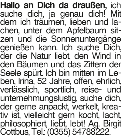 Irina 52 Hallo an Dich da draußen, ich suche dich, ja genau dich! Mit dem ich träumen, lieben und lachen, unter dem Apfelbaum sitzen und die Sonnenuntergänge genießen kann. Ich suche Dich, der die Natur liebt, den Wind in den Bäumen und das Zittern der Seele spürt. Ich bin mitten im Leben, Irina, 52 Jahre, offen, ehrlich, verlässlich, sportlich, reise- und unternehmungslustig, suche dich, der gerne anpackt, werkelt, kreativ ist, vielleicht gern kocht, lacht, philosophiert, liebt, lebt! Ag. Birgit Cottbus, Tel.: (0355) 54788222.Das könnte Sie auch interessieren