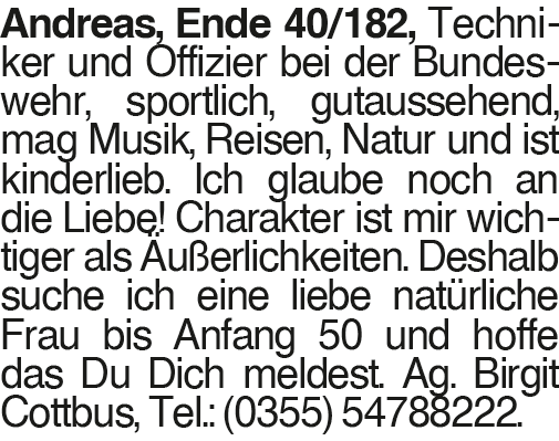 Andreas, Ende 40 Andreas, Ende 40/182, Techniker und Offizier bei der Bundeswehr, sportlich, gutaussehend, mag Musik, Reisen, Natur und ist kinderlieb. Ich glaube noch an die Liebe! Charakter ist mir wichtiger als Äußerlichkeiten. Deshalb suche ich eine liebe natürliche Frau bis Anfang 50 und hoffe das Du Dich meldest. Ag. Birgit Cottbus, Tel.: (0355) 54788222.Das könnte Sie auch interessieren