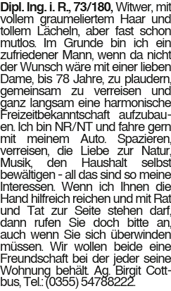 Dipl.-Ing. i. R. Dipl. Ing. i. R., 73/180, Witwer, mit vollem graumeliertem Haar und tollem Lächeln, aber fast schon mutlos. Im Grunde bin ich ein zufriedener Mann, wenn da nicht der Wunsch wäre mit einer lieben Dame, bis 78 Jahre, zu plaudern, gemeinsam zu verreisen und ganz langsam eine harmonische Freizeitbekanntschaft aufzubauen. Ich bin NR/NT und fahre gern mit meinem Auto. Spazieren, verreisen, die Liebe zur Natur, Musik, den Haushalt selbst bewältigen - all das sind so meine Interessen. Wenn ich Ihnen die Hand hilfreich reichen und mit Rat und Tat zur Seite stehen darf, dann rufen Sie doch bitte an, auch wenn Sie sich überwinden müssen. Wir wollen beide eine Freundschaft bei der jeder seine Wohnung behält. Ag. Birgit Cottbus, Tel.: (0355) 54788222.