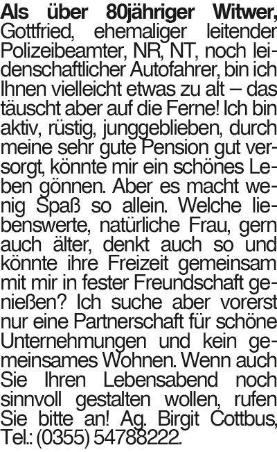 Gottfried Als über 80jähriger Witwer, Gottfried, ehemaliger leitender Polizeibeamter, NR, NT, noch leidenschaftlicher Autofahrer, bin ich Ihnen vielleicht etwas zu alt # das täuscht aber auf die Ferne! Ich bin aktiv, rüstig, junggeblieben, durch meine sehr gute Pension gut versorgt, könnte mir ein schönes Leben gönnen. Aber es macht wenig Spaß so allein. Welche liebenswerte, natürliche Frau, gern auch älter, denkt auch so und könnte ihre Freizeit gemeinsam mit mir in fester Freundschaft genießen? Ich suche aber vorerst nur eine Partnerschaft für schöne Unternehmungen und kein gemeinsames Wohnen. Wenn auch Sie Ihren Lebensabend noch sinnvoll gestalten wollen, rufen Sie bitte an! Ag. Birgit Cottbus, Tel.: (0355) 54788222.