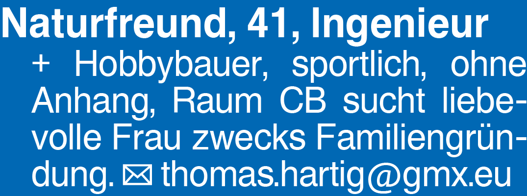 Naturfreund, 41, Ingenieu + Hobbybauer, sportlich, ohne Anhang, Raum CB sucht liebevolle Frau zwecks Familiengründung. thomas.hartig@gmx.euDas könnte Sie auch interessieren