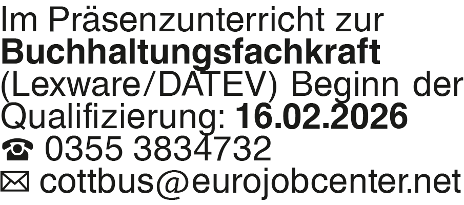 Im Präsenzunterricht zur Im Präsenzunterricht zur Buchhaltungsfachkraft (Lexware/DATEV) Beginn der Qualifizierung: 16.02.2026 0355 3834732 cottbus@eurojobcenter.net