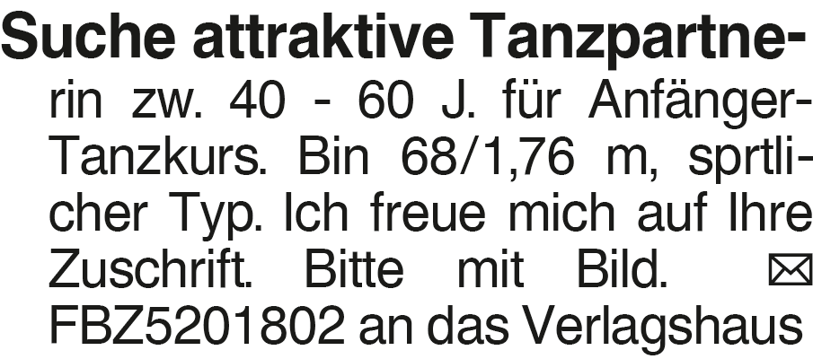 Suche attraktive Tanzpart Suche attraktive Tanzpartne- rin zw. 40 - 60 J. für Anfänger-Tanzkurs. Bin 68/1,76 m, sprtlicher Typ. Ich freue mich auf Ihre Zuschrift. Bitte mit Bild. FBZ5201802 an das VerlagshausDas könnte Sie auch interessieren