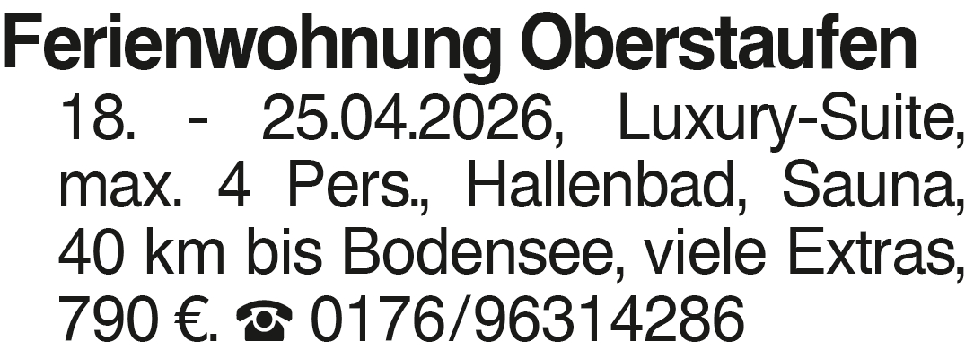 Ferienwohnung Oberstaufen Ferienwohnung Oberstaufen 18. - 25.04.2026, Luxury-Suite, max. 4 Pers., Hallenbad, Sauna, 40 km bis Bodensee, viele Extras, 790 EUR. 0176/96314286Kontakt