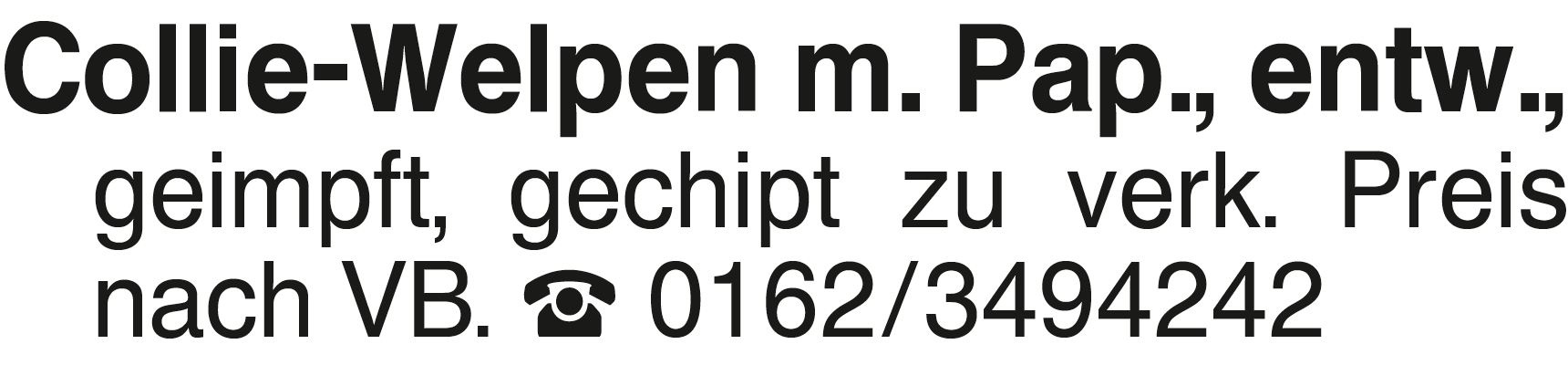 Collie-Welpen m. Pap., en Collie-Welpen m. Pap., entw., geimpft, gechipt zu verk. Preis nach VB. 0162/3494242