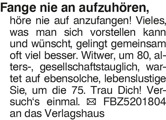 Fange nie an aufzuhören, Fange nie an aufzuhören, höre nie auf anzufangen! Vieles, was man sich vorstellen kann und wünscht, gelingt gemeinsam oft viel besser. Witwer, um 80, alters-, gesellschaftstauglich, wartet auf ebensolche, lebenslustige Sie, um die 75. Trau Dich! Versuch s einmal. FBZ5201804 an das VerlagshausDas könnte Sie auch interessieren