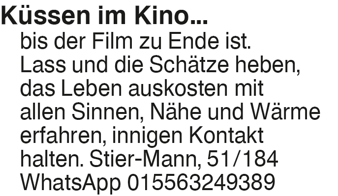 Küssen im Kino... bis der bis der Film zu Ende ist. Lass und die Schätze heben, das Leben auskosten mit allen Sinnen, Nähe und Wärme erfahren, innigen Kontakt halten. Stier-Mann, 51/184 unter WhatsApp 015563249389 rene.naefe1@gmail.comDas könnte Sie auch interessieren