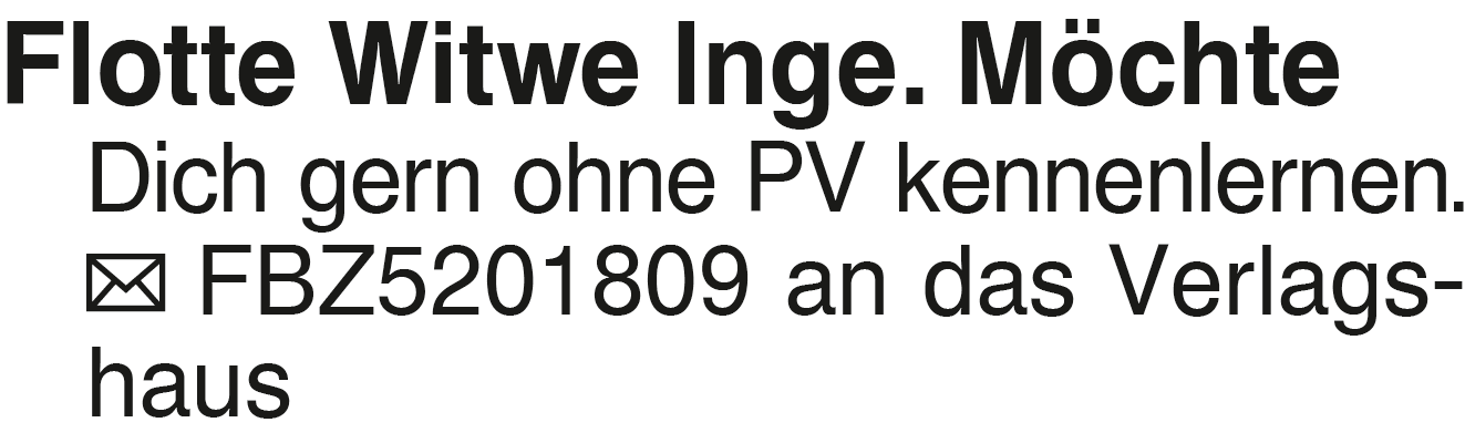 Flotte Witwe Inge. Möchte Flotte Witwe Inge. Möchte Dich gern ohne PV kennenlernen. FBZ5201809 an das VerlagshausDas könnte Sie auch interessieren