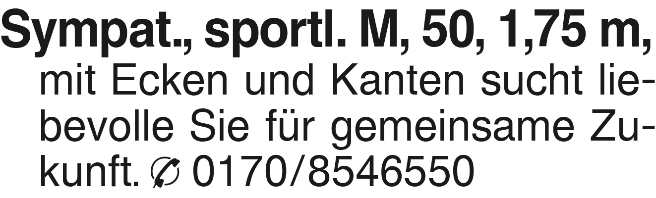 Sympat., sportl. M, 50, 1 Sympat., sportl. M, 50, 1,75 m, mit Ecken und Kanten sucht liebevolle Sie für gemeinsame Zukunft. 0170/8546550Das könnte Sie auch interessieren