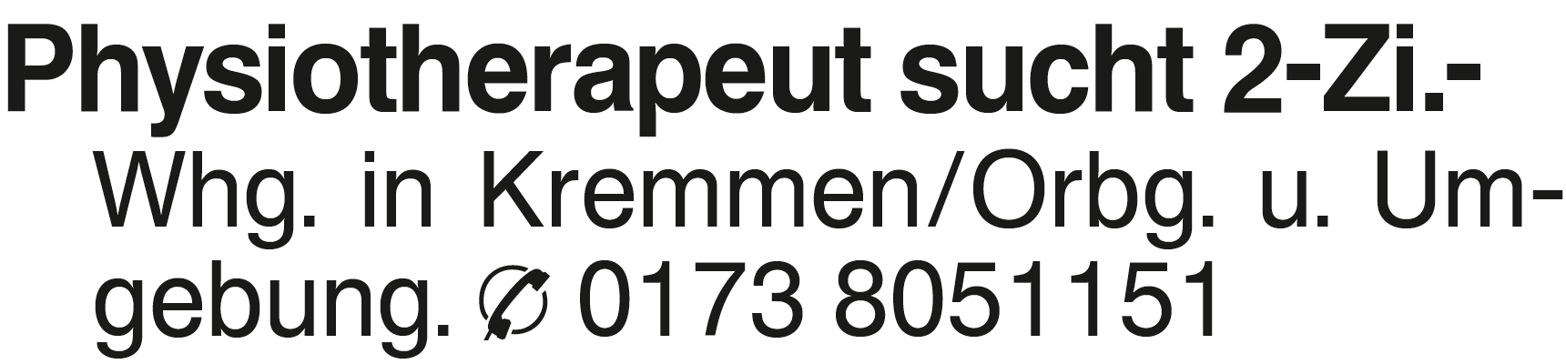 Physiotherapeut sucht 2-Z Physiotherapeut sucht 2-Zi.- Whg. in Kremmen/Orbg. u. Umgebung. 0173 8051151Kontakt