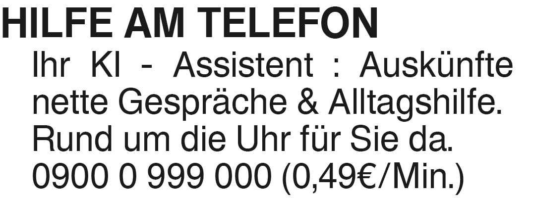 HILFE AM TELEFON Ihr KI - Ihr KI-Assistent Auskünfte, Gespräche, Alltagshilfe. Rund um die Uhr für Sie da. 0900 0 999 000 (max. 0,49 EUR/Min.) Tel. (03338) 3380112